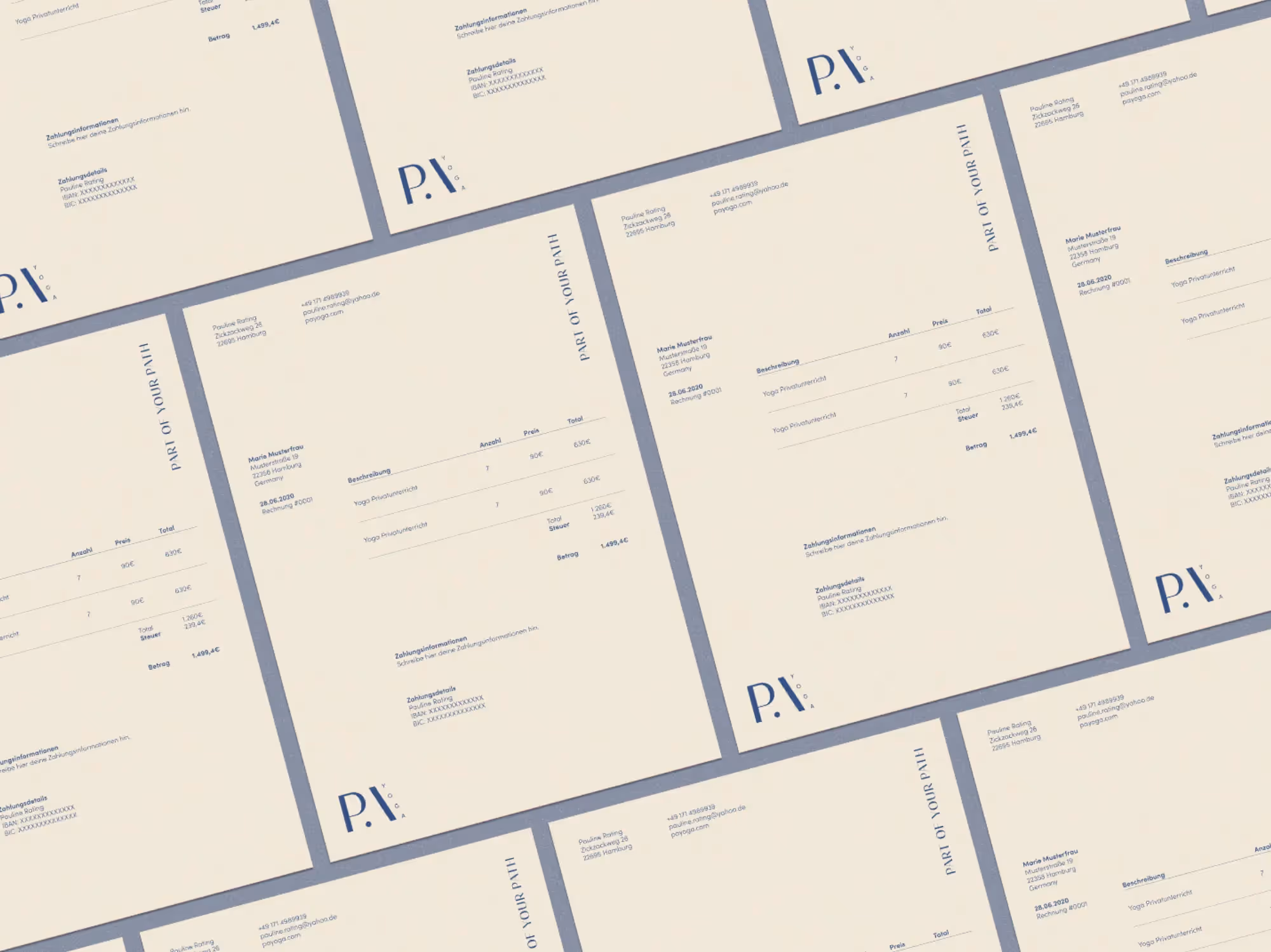 A full visual identity from start to finish for a young yoga teacher from Hamburg, Germany. A trustworthy but still playful identity reflects her personality, natural elements and the topics she wants to communicate with her audience. The logo represents the forward folding pose with the letter P and the dot being the head of the person, but also showing the brand name of PA Yoga. Coming up with the slogan “Part of your path” included not just her initials but also showed her mission to guide people with more mindfulness on their path. The job also included the creation of visual content for her social media.